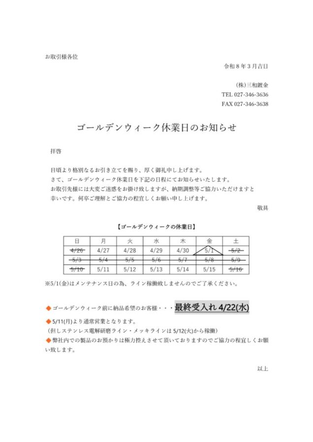 ゴールデンウィークの通知